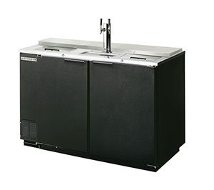 Thanks to its combination of club top refrigerated storage bins and 3 diameter beer tap with cold air intake this Beverage Air DD50C 1 B club top beer dispenser lets you serve cool frosty draft beer and canned or bottled beverages from the same cooler. The Beverage Air DD50C 1 B 50 kegerator can hold two half size kegs and features dual self closing doors to help prevent temperature loss. The Beverage Air DD50C 1 B beer dispenser s 1 3 hp compressor uses R134A refrigerant to maintain a temperature range of 33 to 38 degrees Fahrenhiet. It is insulated with CFC free polyurethane that both increases its energy efficiency and structural strength. The Bev Air DD50C 1 B 50 kegerator is UL and NSF Listed and requires a 115V electrical connection. An 8 power cord and plug are included. Consult the Specification Sheet for additional details and installation requirements. Dimensions 50 W x 28 3 16 D x 37 1 4 H Capacity 19.8 cu. ft. DD50C-1-B From Beverage Air